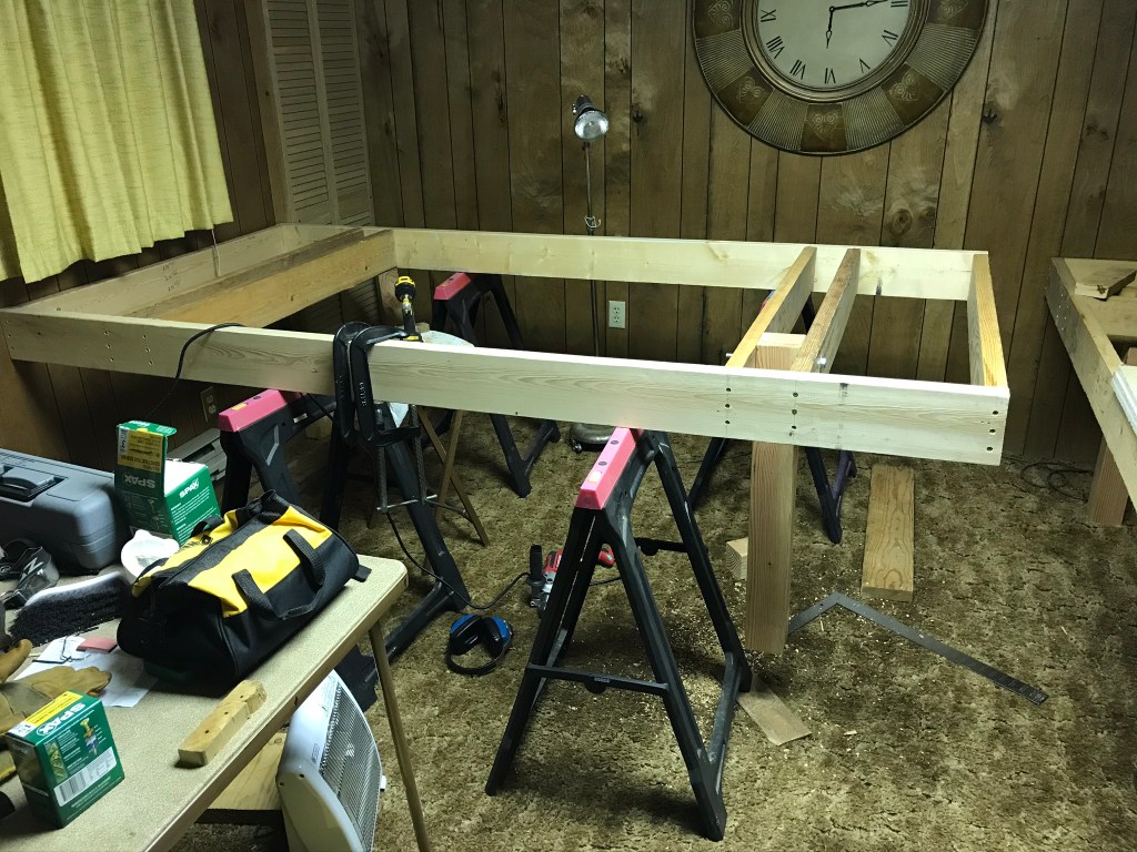 I didn’t chronicle a lot of this table’s construction since it was identical to the first. The only difference was that the size of this one was half that of the first one. This one is 4X8 where the first one was 4X16. These two will eventually be bolted together to form an L shaped table.