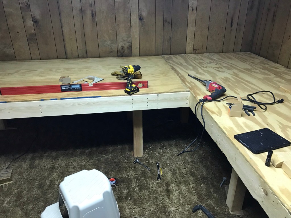 Mating the two tables. I had to get the small table at just the right height. I had to level it too. Not an easy thing to do on an uneven basement floor.