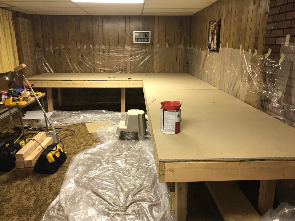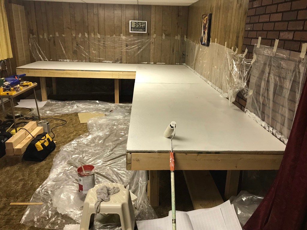 Lining the wall with the plastic drop cloth was harder than it looked. The table is almost flush against the wall in some places. But now it’s ready for the first coat.Just about two thirds done. This time I had ventilation, but I remember that because of the time of year it was, it got very humid down there while I was rolling it on. I was actually dripping on the table. It was then that I decided to wait until a little cooler time of the year for the second coat.First coat complete!